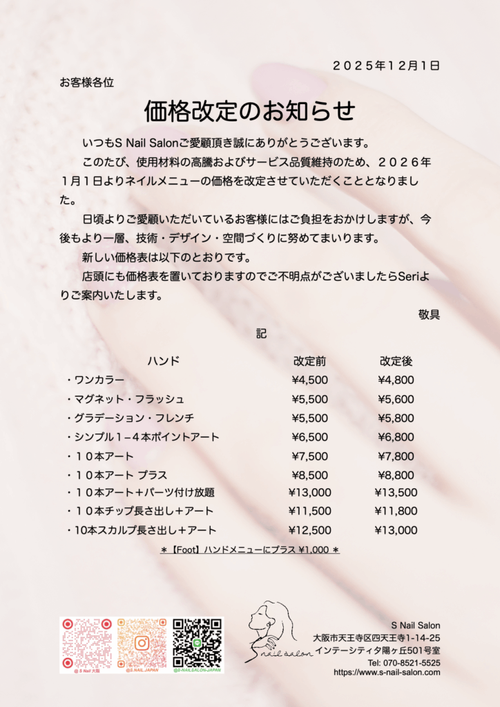 S Nail Salon価格改定のお知らせ